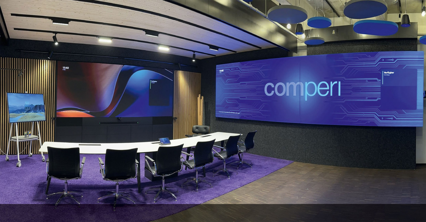 A 164-inch SMD LED wall from Samsung from the IER series with a pixel pitch of 1.5 mm is at the center of this room. This 21:9 format is in line with the trend towards widescreen formats and offers an ideal video surface for hybrid board meetings with programs such as Teams or Zoom. A seamless transition is made possible by a connection module that enables precise synchronization and color matching between the two 146-inch displays, which are only plugged together during setup. The quick installation, which only takes around two days for the LED walls, is impressive. The all-in-one concept of the product makes it possible, because despite the size of the displays, no repairs to the wall or substructures are required.